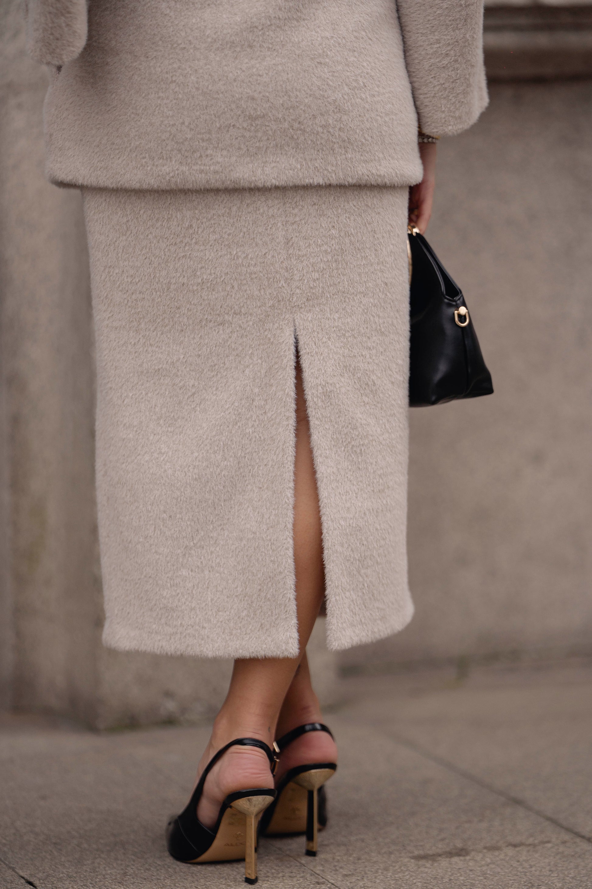 Saia midi em formato lápis, de cintura subida com fecho invisível para fechar.