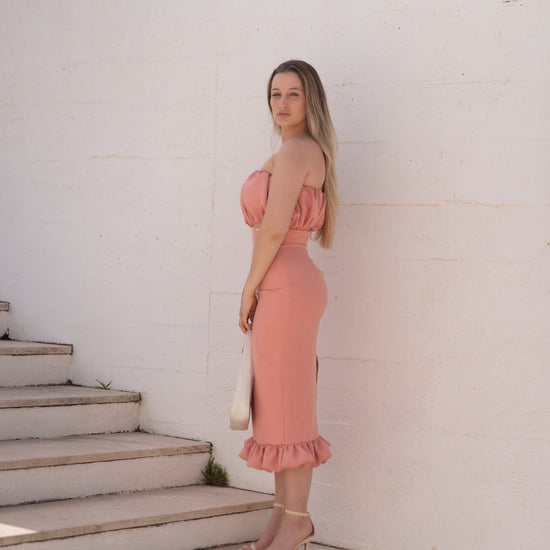 Saia midi de cintura subida , totalmente forrada. Com detalhe de folho em baixo e fecho atrás para abrir.