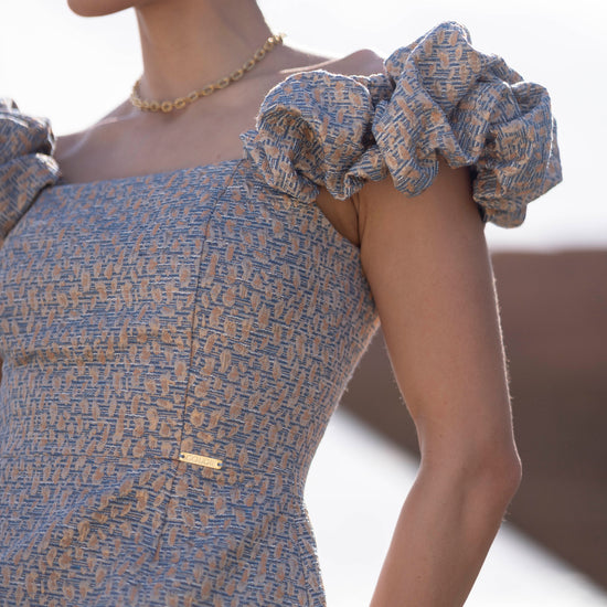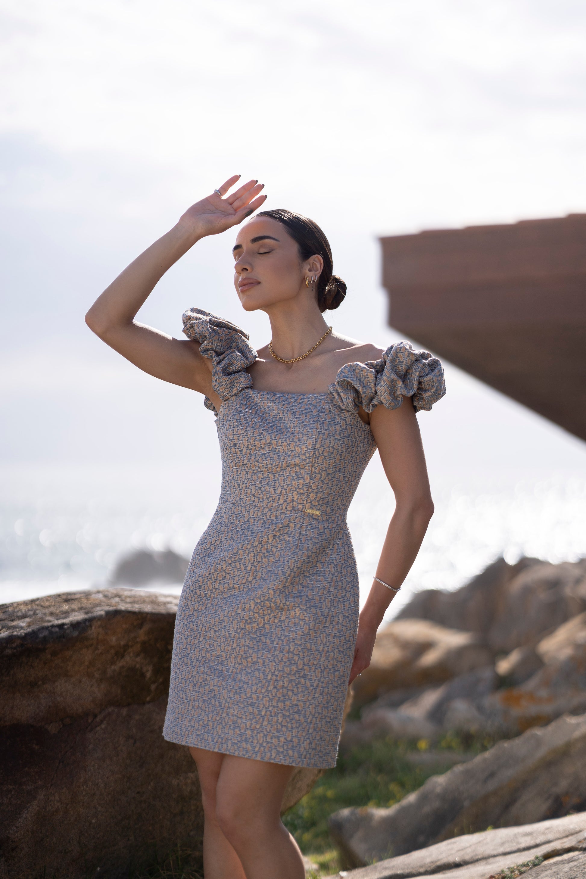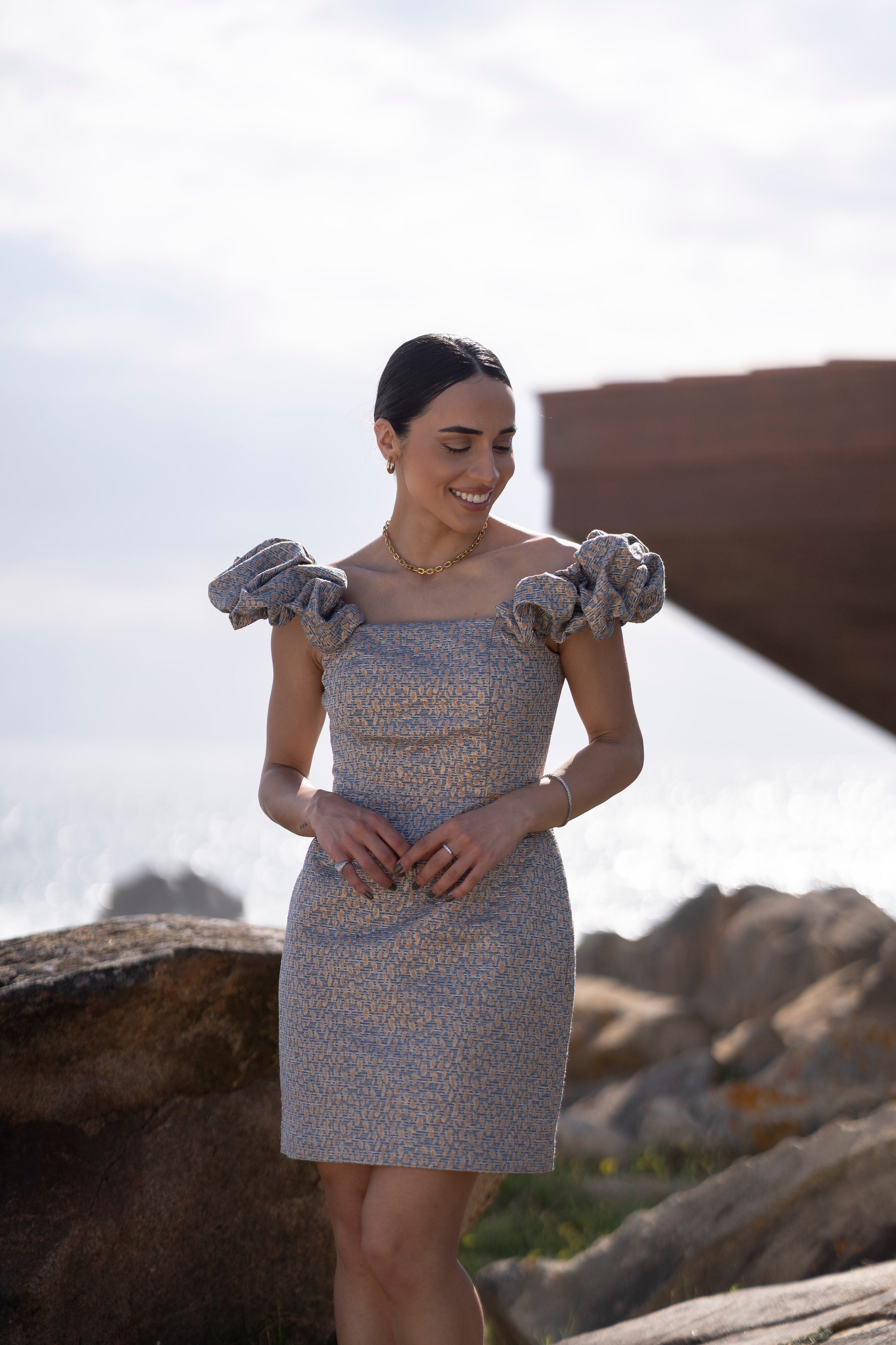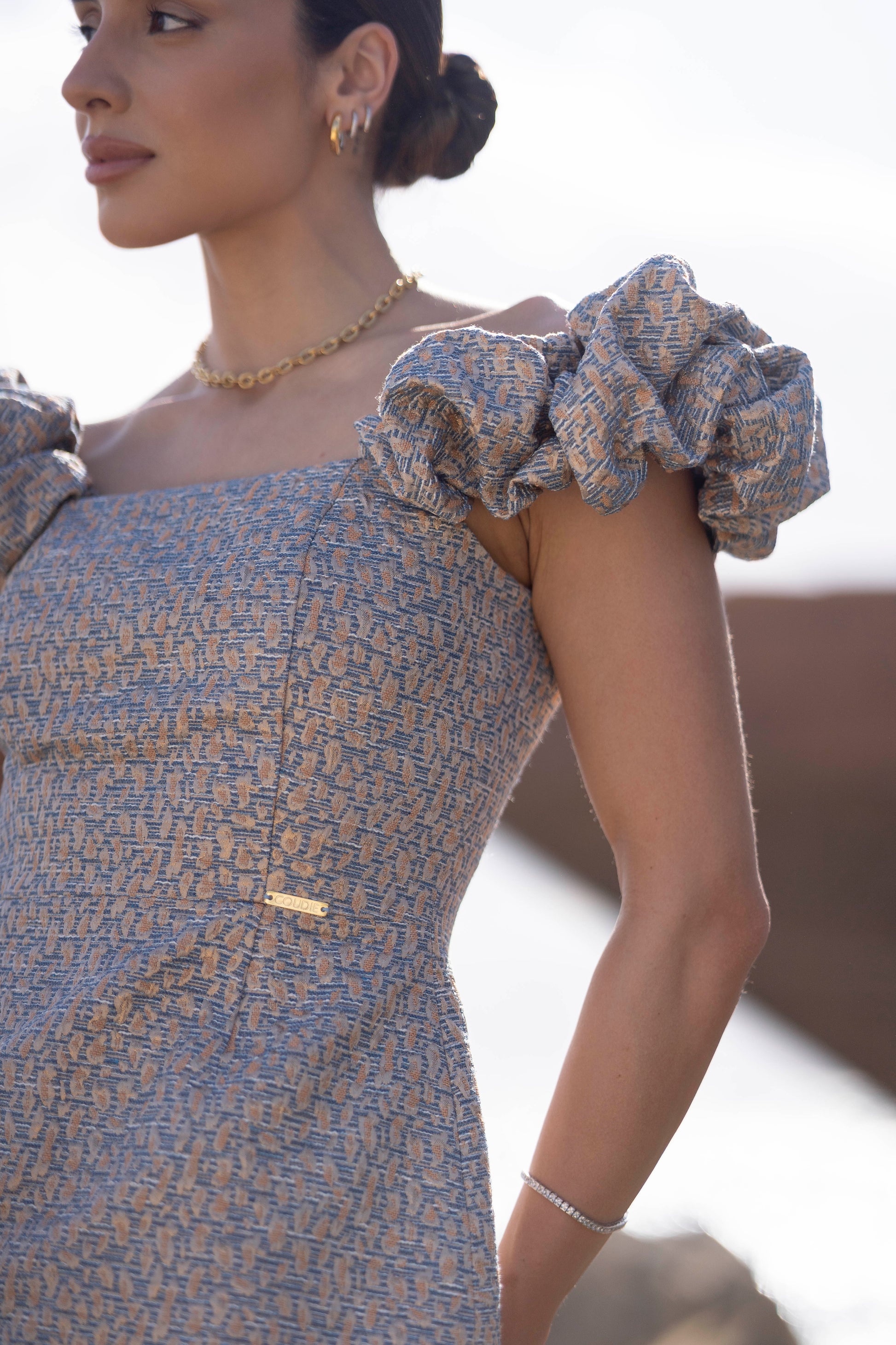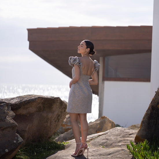 Vestido curto com alças tufadas. Decote quadrado e costas abertas em quadrado também, fecho invisível atrás para fechar.