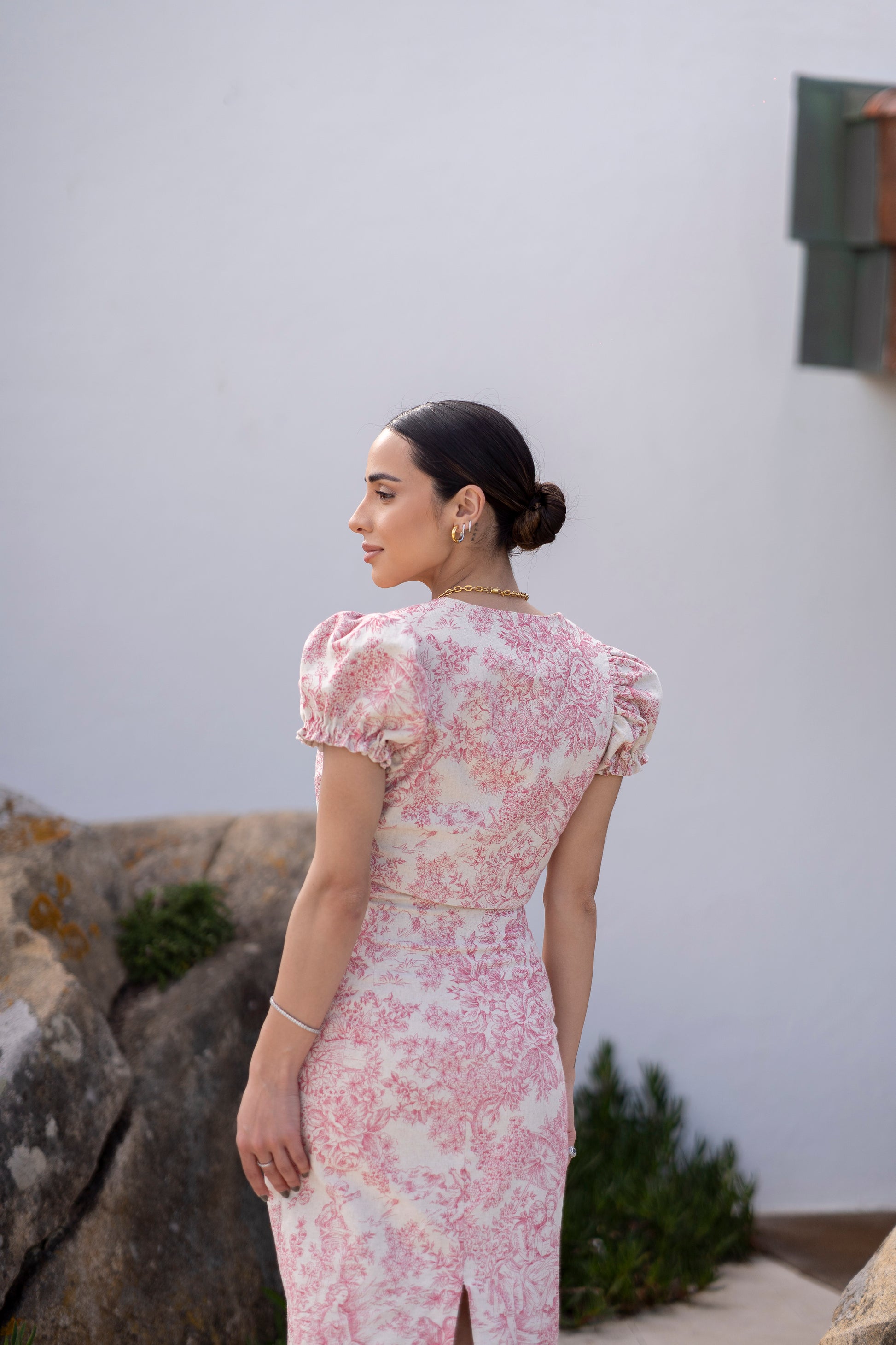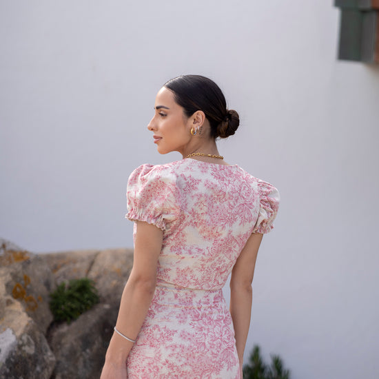 Vestido midi em linho. São duas peças que juntas formam um vestido midi mas também podem ser usadas em separado - como saia e blusa.