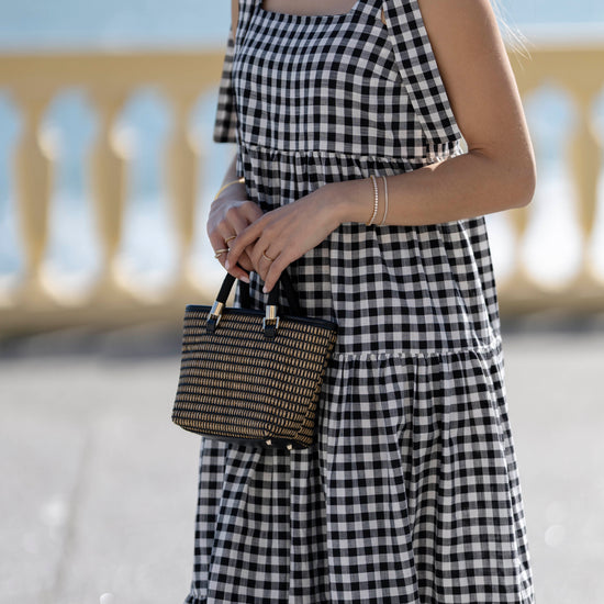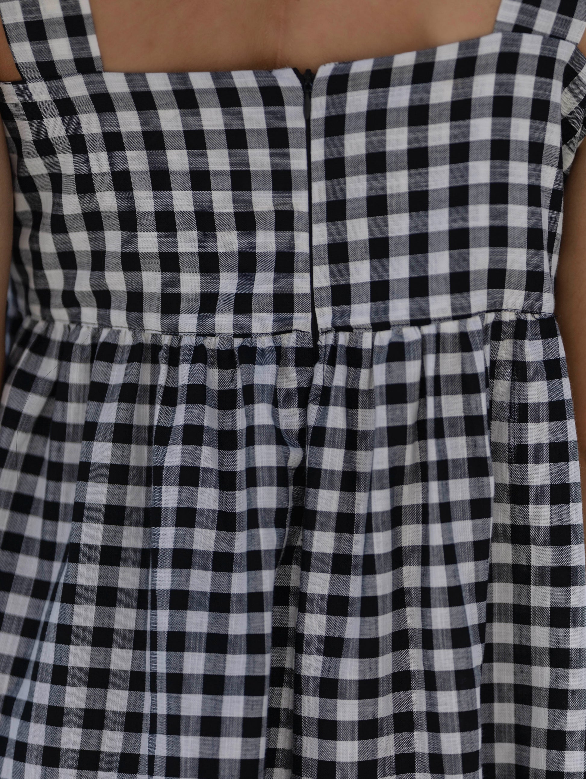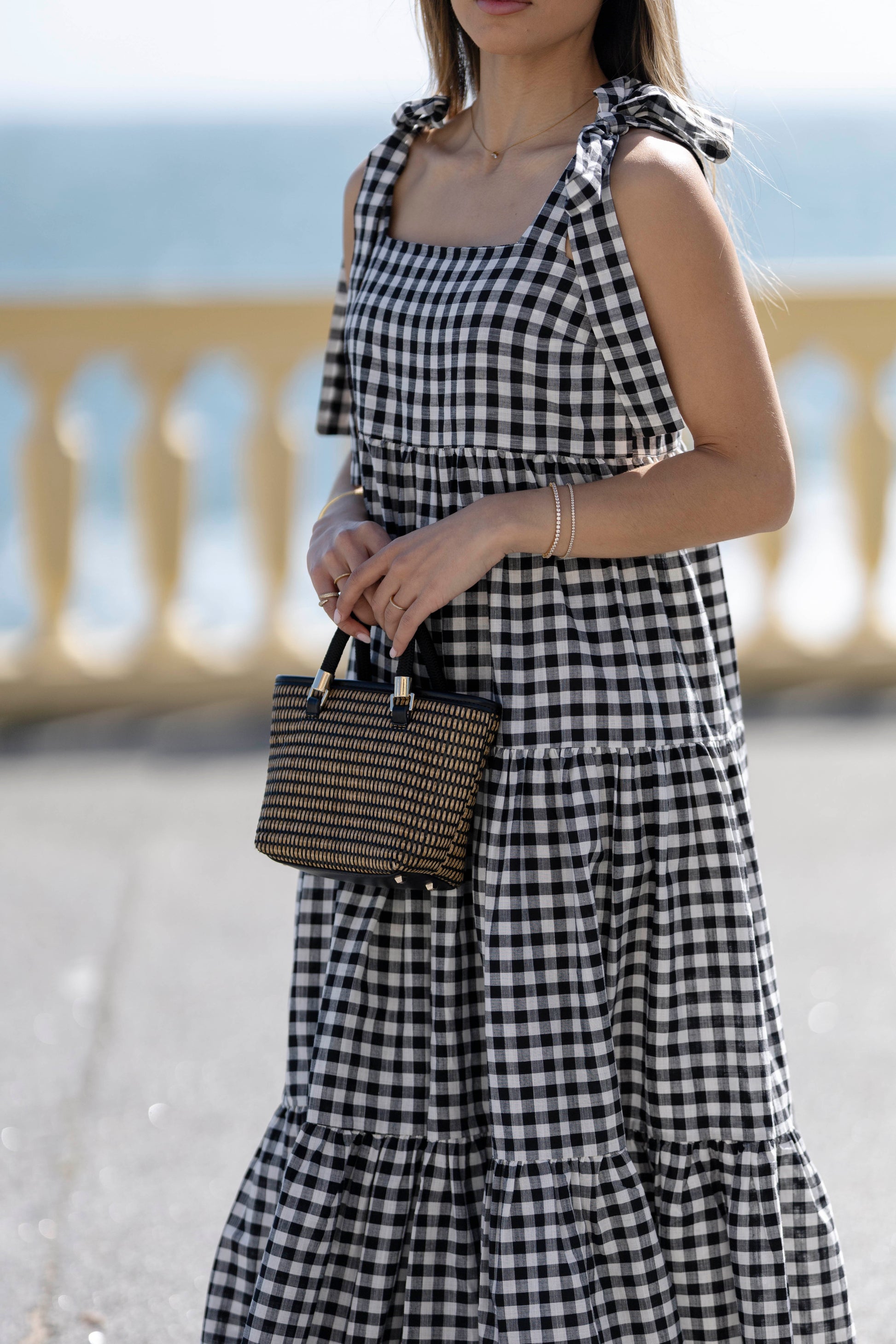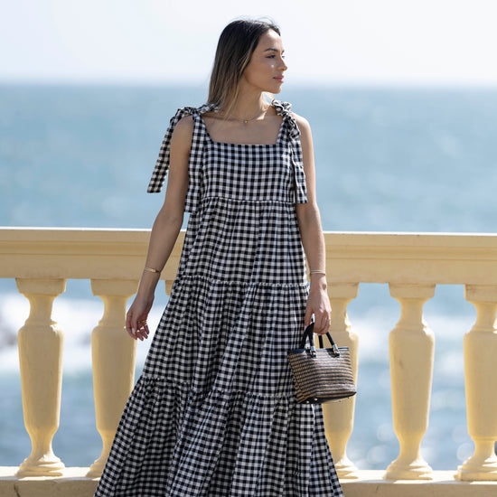 Vestido comprido com quadrados. Alças que apertão com nó/laço e fecho invisível nas costas para abrir.